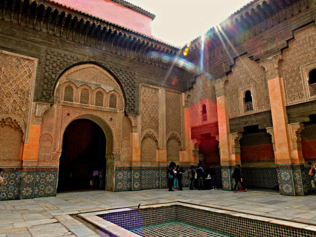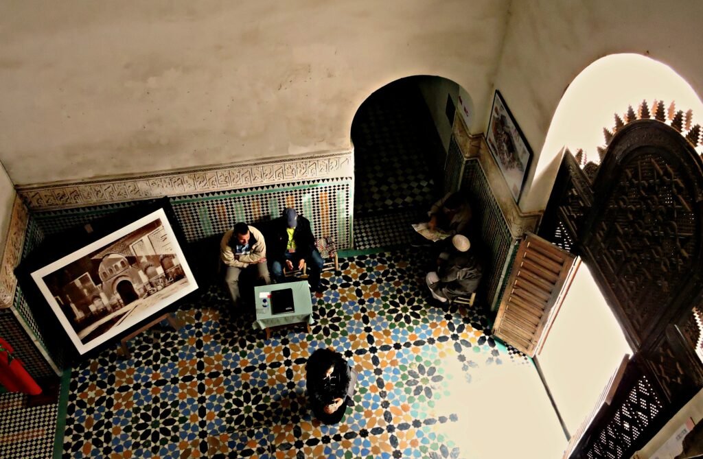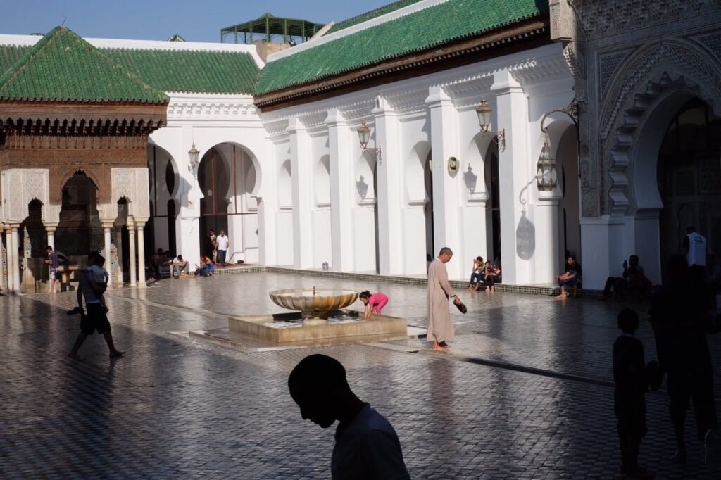 The library is full of extremely rare and some unique books and manuscripts and there are more than 4,000 of them , including a 9th century Koran written on camel’s skin with a kind of beautiful calligraphy called Kufic , as well as the first known Islamic Hadith and an original manuscript of Mukkadimah, a world history written in 1377 by the philosopher Ibn Khaldun , which many scholars consider the first exploration of the fields we know today as sociology, historiography, demography and other social sciences. It is especially important that today we have a book written by his hand, as after graduating from Qarawiyyin University he began his career as a calligrapher at the Chancellery of Tunis. Shortly afterwards ,when he moved to Fez , he worked on writing the royal proclamations for the Sultan.
