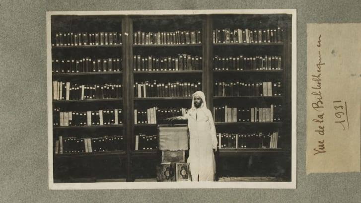A librarian at al-Qarawiyyin in 1931Bougchouf, curator of the Qarawiyyin library, opens the first page of an original version of Ibn Khaldun’s most famous work, Muqadimmah, dating back to the 14th century at the Al-Qarawiyyin mosque
